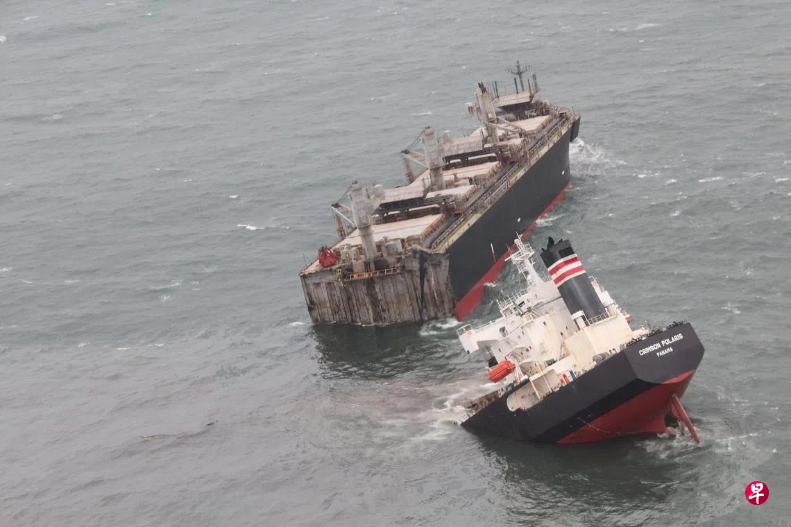 一艘巴拿马注册名为深红北极星号的货船,周三在日本北部八户港口搁浅,船身隔天断成两截(图)并造成油污泄漏,漏油面积为5.1公里长、约1公里宽。日本海岸警卫队说,船上21名船员无人受伤,巡逻艇已采取行动将漏油情况控制下来。这艘货船排水量近4万吨,两截船身目前距离港口约4公里,当局正密切留意船身的情况。(路透社)