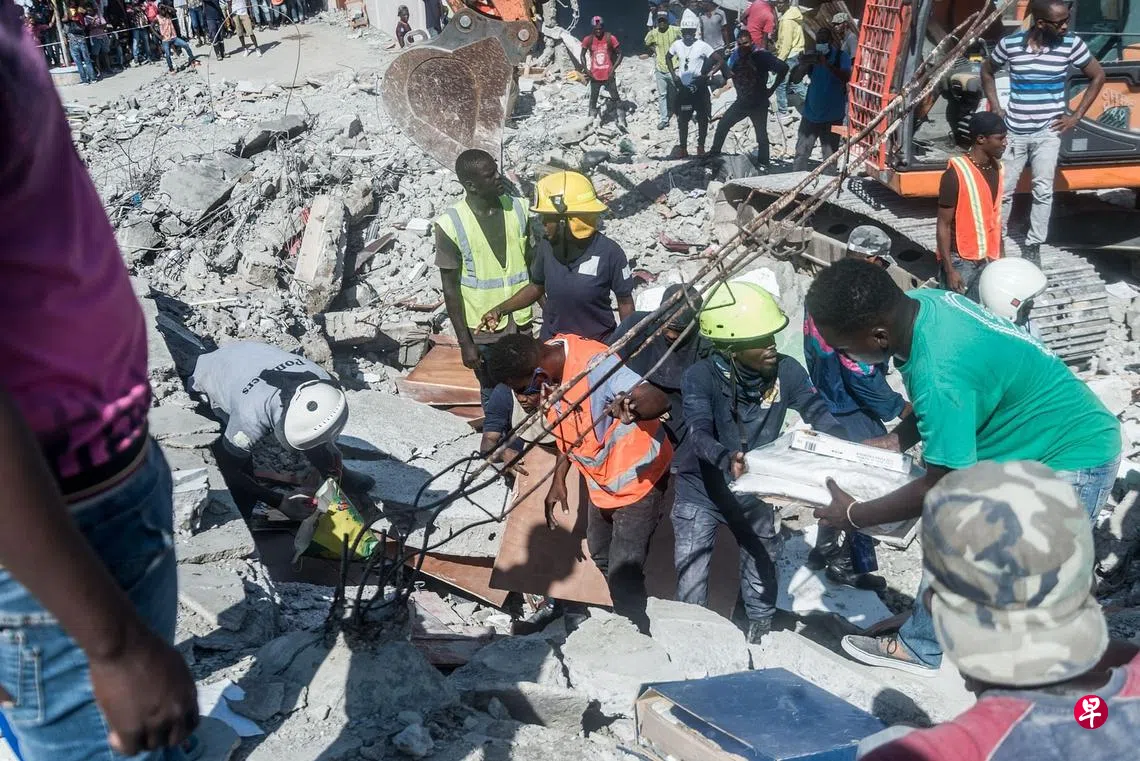 (太子港综合电)海地上周六大地震死伤人数激增,截至当地时间15日下午,死亡人数上升至1297人,受伤人数超过5700人。搜救人员仍旧争分夺秒,在倒塌建筑里寻找幸存者。