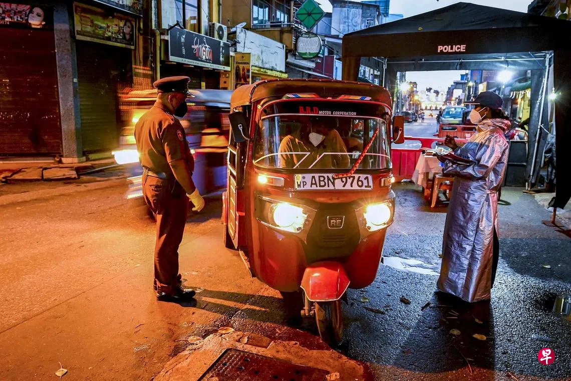 斯里兰卡本月20日开始实施10天全国宵禁,每天晚上10时到凌晨4时限制行动。宵禁措施实施一周后,冠病疫情未见好转,卫生部长朗布卫拉27日宣布,延长宵禁一周,至9月6日凌晨。周四晚上,在首都科伦坡一个检查站,执勤警员正在检查证件,确保出行者遵守宵禁措施。斯里兰卡目前只对30岁以上的人,以及需到海外留学的学生接种疫苗。该国已有48%人接种了两剂疫苗。(法新社)