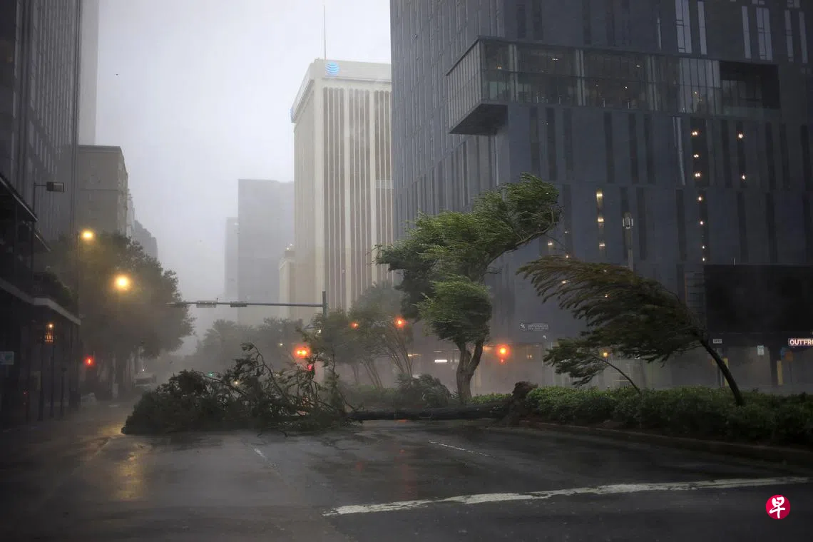 四级飓风艾达从墨西哥湾登陆美国路易斯安那州,带来强风和豪雨,造成该州最大城市新奥尔良全市电力中断,至少一人丧命。艾达是今年吹袭美国的第一股强力飓风,星期天中午登陆时,风力达每小时240公里,比16年前重创新奥尔良的卡特里娜飓风还要强。图为强风将新奥尔良市中心树木吹倒的情景。美国总统拜登已宣布路易斯安那州发生重大灾难,下令为20多个受灾地区提供联邦援助。不过,艾达在登陆后风力减弱,到周一上午已降为热带风暴。(彭博社)