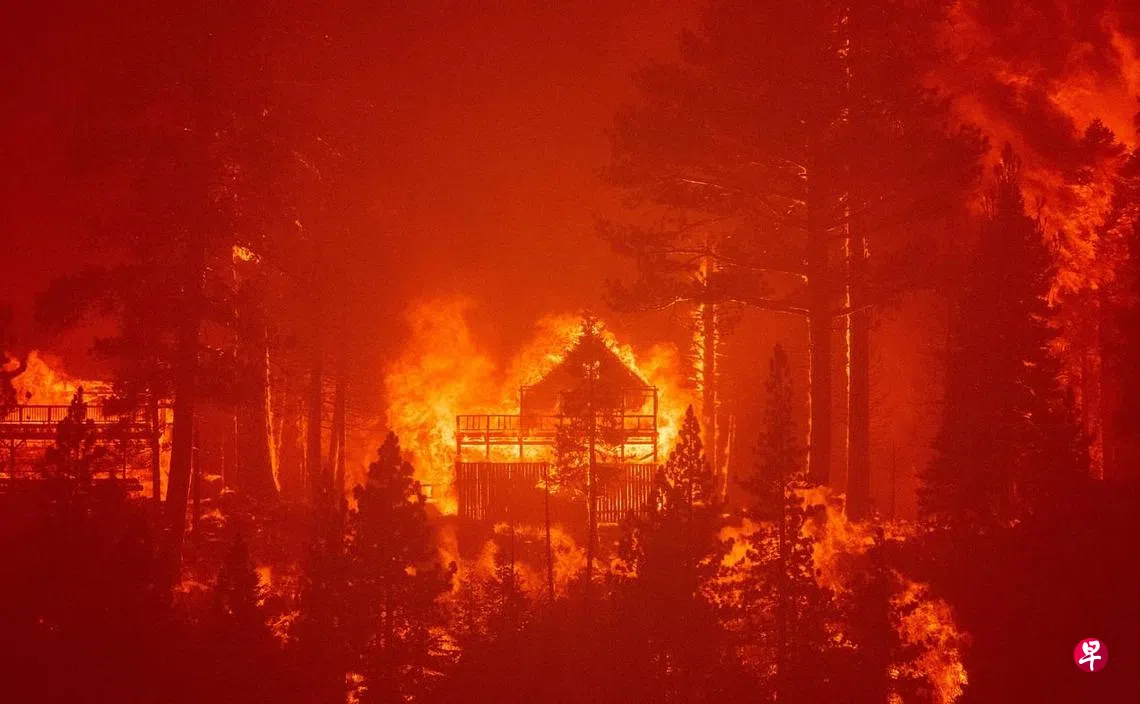 在美国加利福尼亚州迅速狂烧的卡尔多林火已焚毁650多个建筑,另外有数千座建筑物面临大火的威胁。8月30日的照片显示,火舌窜越加州北部的塞拉内华达山脉,直逼太浩湖南畔的度假社区,火场附近火红一片,空气中弥漫着令人窒息的烟雾。地方政府30日已向数千人发出疏散命令。持续两周的大火席卷广达700平方公里的土地。失控的林火迫使森林服务局采取不寻常之举,今天起封锁全州18个国家公园,为期至少17天。(法新社)