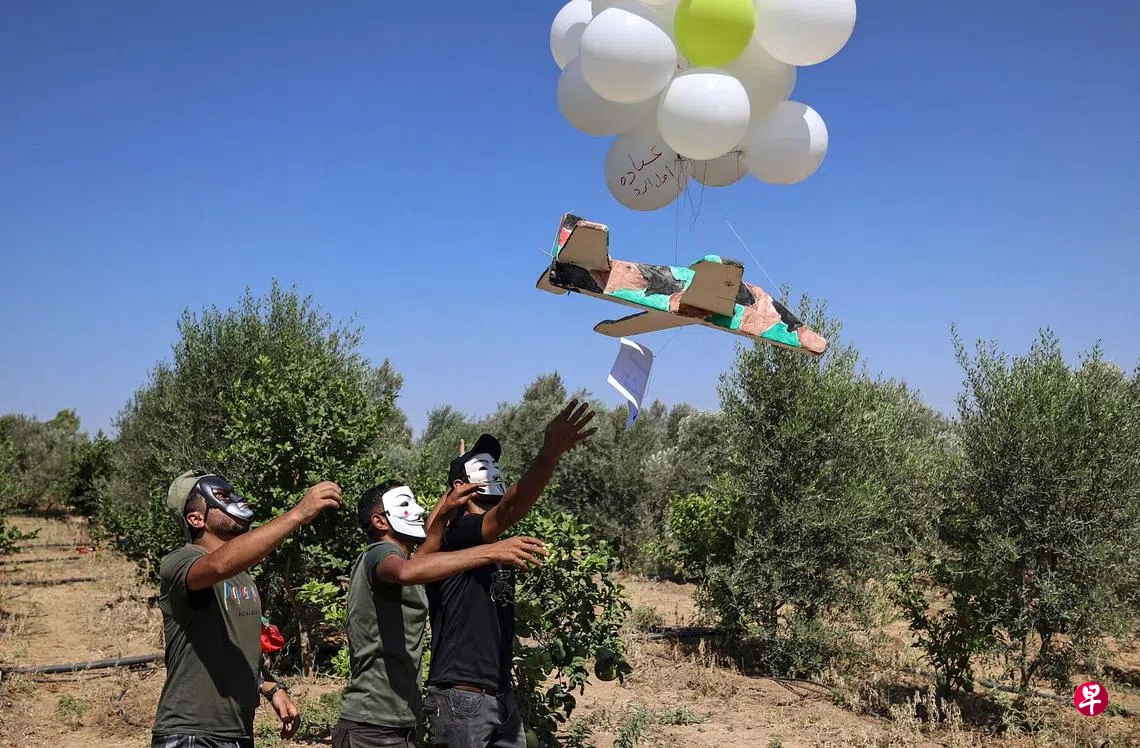 以巴冲突持续升温,埃及、约旦和巴勒斯坦领导人9月2日在埃及首都开罗举行三方峰会,分析人士认为,这可能为推动以色列及巴勒斯坦和平进程铺平道路。尽管以巴双方之前已达成停火协议,但加沙地带的巴勒斯坦人近一个月来不断向以色列南部放出带有燃烧弹的气球,招致以军空袭反击,双方再起冲突,停火协议形同虚设。图为巴勒斯坦人周六又往以色列方向放出燃烧弹气球。(法新社)
