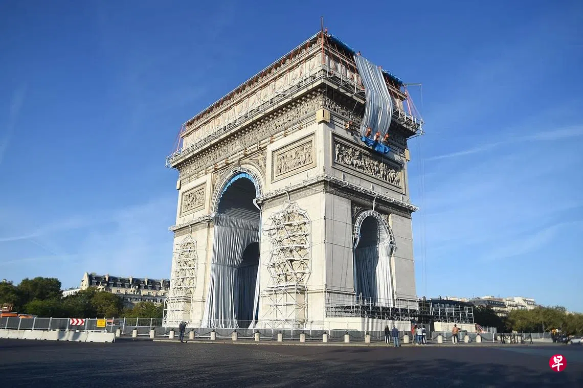 工作人员星期天从巴黎凯旋门顶部悬下大片银蓝色面料,开始为这个著名地标换上新装,以向已故“包裹大师”克里斯托(Christo)夫妇致敬。克里斯托与妻子珍妮-克劳德(Jeanne-Claude)是以包裹建筑物著称的大地艺术家,两人相识于巴黎,包裹凯旋门是他们多年的愿望。这个艺术装置将使用超过2万5000平方米的面料与3000米红绳,并预计于本周六完工。(法新社)