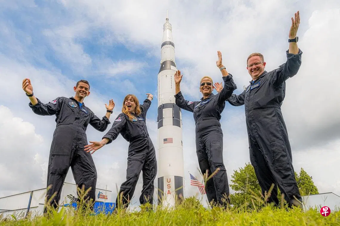 美国太空探索技术公司(SpaceX)本周三晚上8时(新加坡时间周四早上8时)将把四个平民送上太空,展开首个平民环绕地球之旅。这四个非专业宇航员为美国亿万富翁企业家、Shift4 Payments公司创始人艾萨克曼(左起)、在童年时期战胜了癌症的阿西诺、地质学博士和科学传播者普罗克特及工程师森布罗斯基。