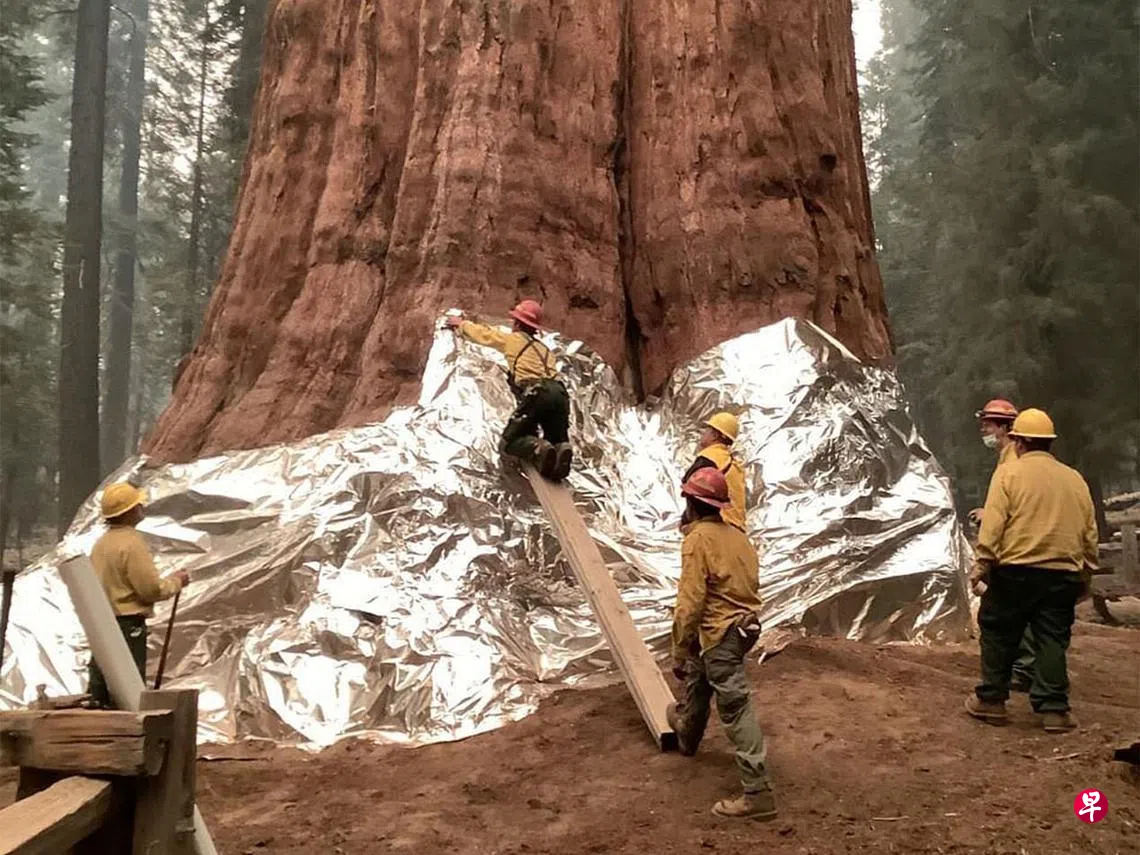 美国加利福尼亚州的野火延烧,美洲杉国家公园中的千年红杉林也受威胁。消防员加紧用防火膜将珍贵红杉树的基部裹起来,包括这棵世界上最大的树——雪曼将军树(General Sherman)。