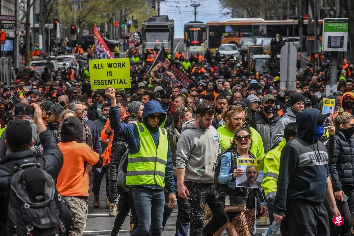 澳大利亚疫情持续蔓延,昨日再有2000多人走上墨尔本街头示威,抗议当局严厉的防疫措施。示威者破坏公物,堵塞高速公路并打伤三名警员。警方发射胡椒球和橡胶球驱散示威者,逾60人被捕。此前,墨尔本当局表示,建筑工人频繁移动,这是冠病散播原因之一,因此宣布关闭建筑工地两周。维多利亚州也要求所有建筑工人在本周内接种至少一剂疫苗。这些措施引发建筑工人的不满。除了建筑工人,示威者还包括反对强制性疫苗接种和维州延长封锁者。(法新社)