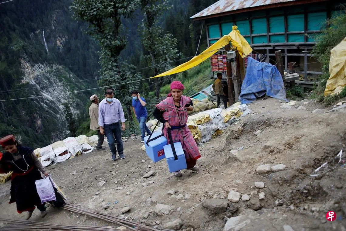 在地域广阔、地形多变的国家,给全民施打疫苗是个艰巨挑战。9月14日,在印度北部喜马偕尔邦库卢区马拉纳村,30岁的印度卫生工作者德维艰难地前进。她带着装有印度版阿斯利康疫苗Covishield的箱子。箱子不算重,但陡峭的地形让她和同事们得步行数小时甚至数日,才能抵达偏远村庄,为村民接种冠状病毒疫苗。尽管地形险恶,但喜马偕尔邦已成为印度第一个为所有成年人注射至少一剂疫苗的邦。(路透社)