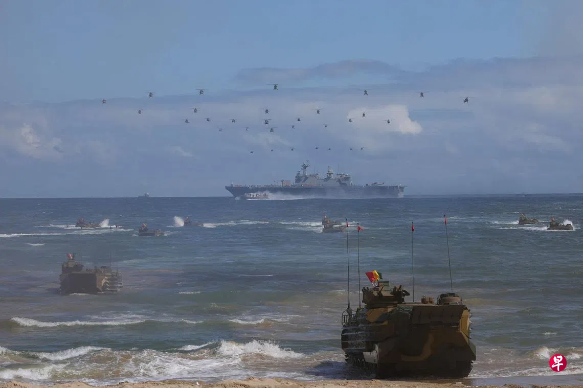 10月1日是韩国国军节,当天的纪念仪式是建军以来首次在海军陆战队第一师团附近的浦项迎日湾举行,韩军还进行了名为“和平缔造者”的陆海空军和海军陆战队联合登陆演习。分析认为,这是考虑到近日朝鲜接连发射导弹恐加剧民众不安,韩军借此展现坚不可摧的国防态势。总统文在寅当天出席活动时也强调,政府和军方会坚决应对任何威胁国民生命和安全的行为。(法新社)