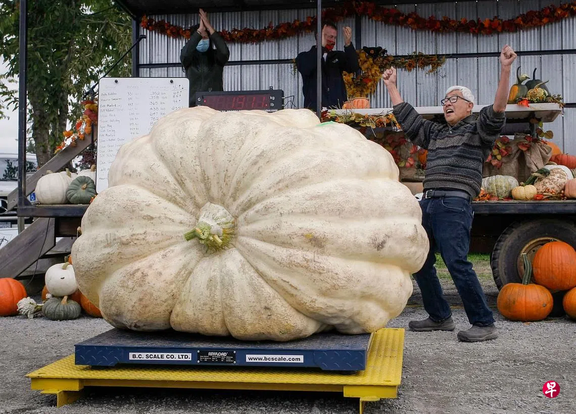 加拿大不列颠哥伦比亚省兰利市周六举行年度巨型南瓜大赛,吸引数十名南瓜种植爱好者参赛。图为本届冠军南瓜“熊爸爸”,重达866公斤,由来自列治文市的陈国安(David Chan)培植而成。陈国安说,他在自家后院种植巨型南瓜已有40年,这是他的兴趣,也是运动锻炼的方式。主办单位表示,希望当地儿童能够通过这场比赛,了解到农业与粮食可持续性的重要性。(新华社)