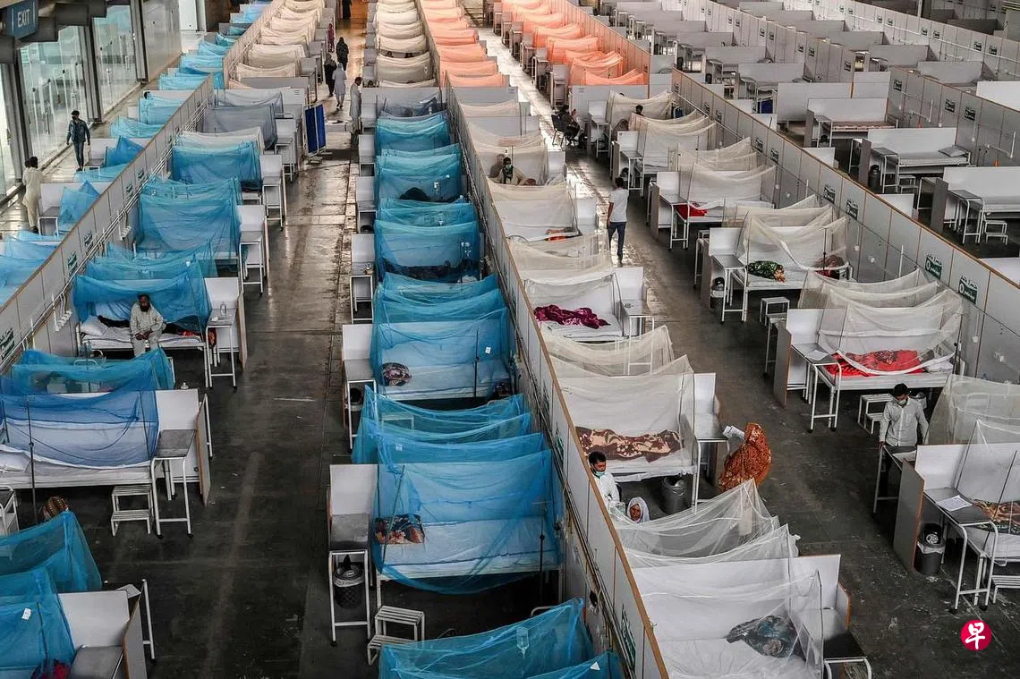 巴基斯坦近日在对抗冠病疫情的同时,还要面对骨痛热症肆虐,当中东部旁遮普省的情况最严重。该省前天通报508起骨痛热症病例,使今年来的累计病例达到5700多起。该省前天也有18人死于骨痛热症,为单日新高。图为旁遮普省首府拉合尔一家医院,因骨痛热症病人过多导致床位短缺,院方被迫增设临时病房。(法新社)