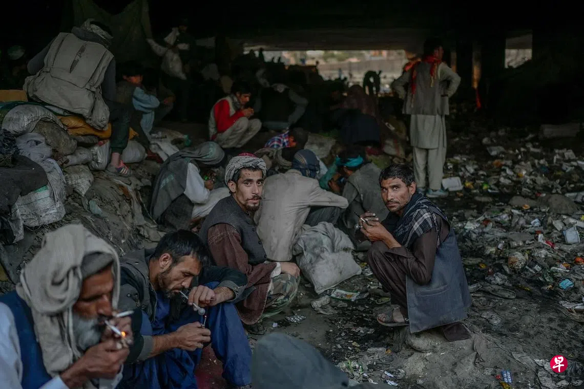阿富汗是全球最大的海洛英生产国,占全球产量的90%。塔利班掌控阿富汗后承诺禁止生产毒品,同时加强了对当地瘾君子聚集地的扫荡行动。据观察,塔利班会派出手持步枪的武装分子来围捕瘾君子,然后把他们送到戒毒所关押45天戒毒。据禁毒专家,阿富汗3400万人口中有11%是吸毒者。图为10月9日当天,一群瘾君子聚集在首都喀布尔一座桥梁下吸毒,他们过后遭塔利班人员带走。(法新社)