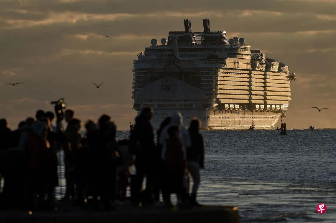 这艘巨无霸重量超过23万6800吨,船长362公尺,可承载多达6988名乘客,外加2300名船员。它在2019年4月开建,但受全球冠病疫情影响,工程延误,投入服务的日期也推迟,最快要到明年3月才能开始载客。这艘游轮本瞄准中国市场,但由于中国仍封锁,它因此会改而先在美国和欧洲之间来回。(法新社)