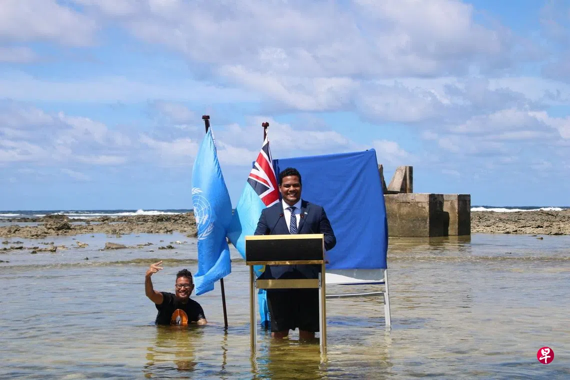 太平洋岛国图瓦卢的司法、通信与外交部长科菲,周二在图瓦卢首都富纳富提向联合国气候变化大会发表视频演讲,只见他卷起裤脚、站在及膝的海水中讲话,直观展示了气候变化与海平面上升对低洼国家的冲击。图瓦卢最高海拔仅约4.5米,是全球最不发达国家之一。尽管污染大国纷纷承诺,在未来数十年大幅减少碳排放,但太平洋岛国指出,气候变化威胁迫在眉睫,必须立即采取行动。(路透社)