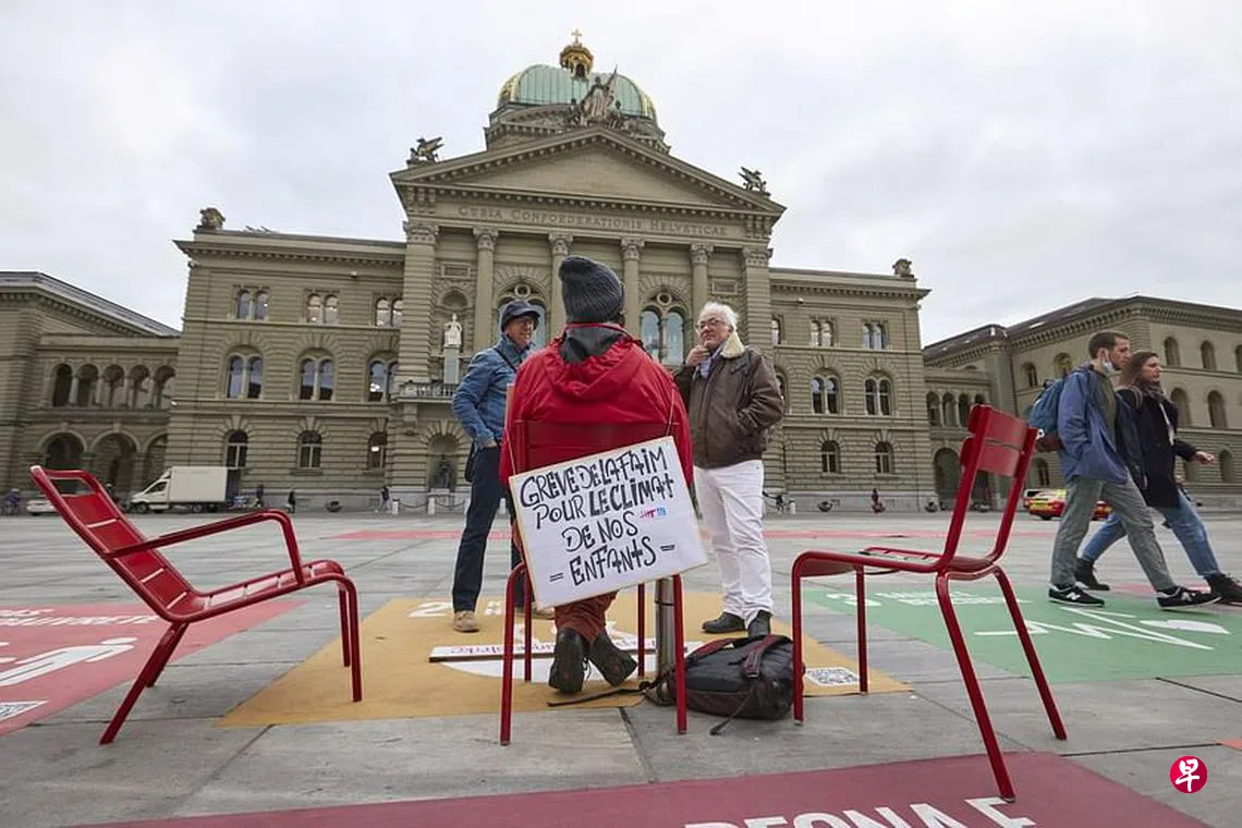 各国领袖汇集格拉斯哥就气候变化商讨对策之际,在瑞士首都伯尔尼的联邦广场,一名男子以行动呼吁政府要做实事。