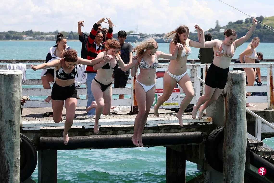 新西兰最大城市奥克兰周三放宽防疫限制,当地零售商店、图书馆、博物馆和动物园时隔85天重新开放,立即引来人潮。图为游人在奥卡湖湾码头跳水游玩,享受久违的户外时光。奥克兰学校将在本月17日恢复面对面授课,但在冠病疫苗种率达90%之前,酒店将继续关闭。目前,奥克兰已有80%适合人口完成疫苗接种。(路透社)