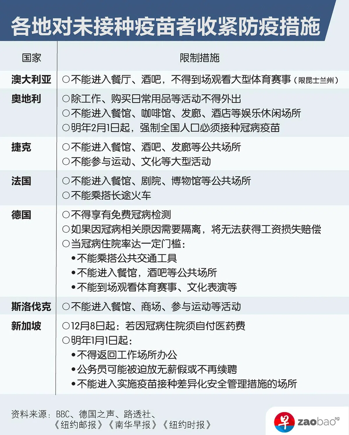其实在新加坡以外,好些国家,特别是最近面临新一波疫情的欧洲,也同样对未接种者采取更强硬的防疫手段。各地未接种者得面对哪些限制措施?他们的反应又如何?zaobao.sg为你整理相关内容,了解未接种者的处境。