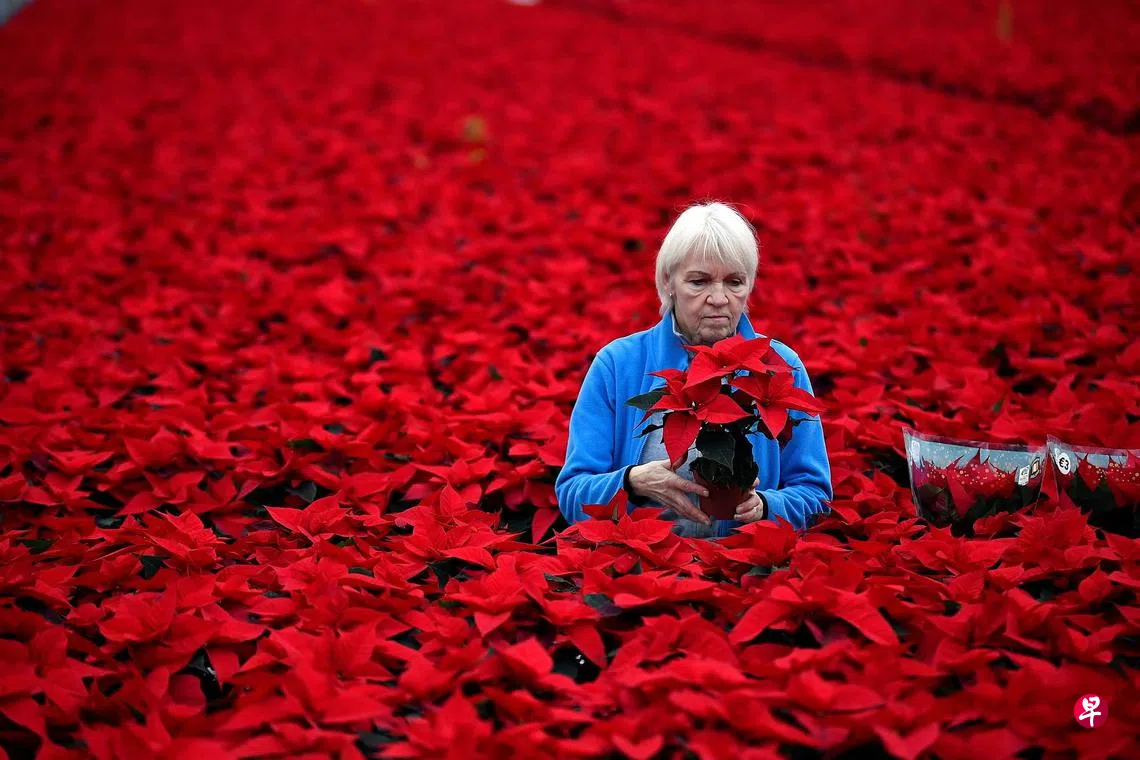 圣诞红又名一品红或圣诞花,是圣诞节广用的装饰摆设草木。其实,那大红是这种植物最顶层的叶子,常被误为花朵。上红下绿相衬,煞是好看。(路透社)