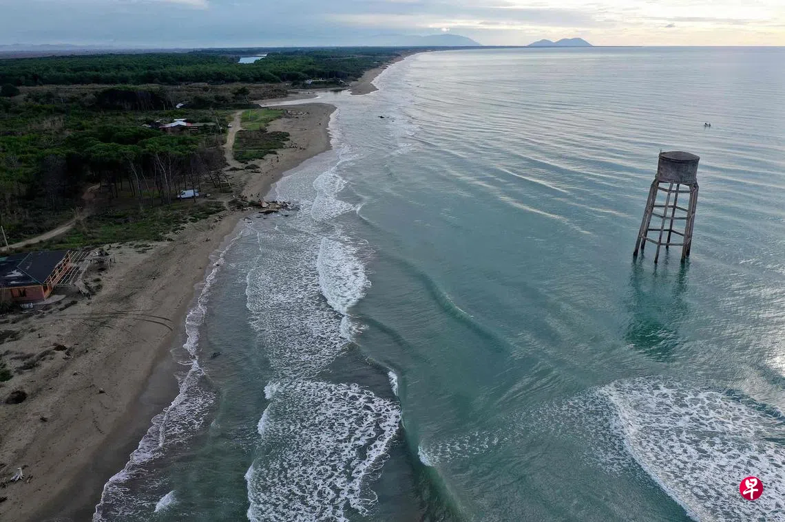 巴尔干小国阿尔巴尼亚是欧洲受海岸侵蚀影响最严重的国家之一,海岸线不断后移,使图中这座水塔成了与陆地隔绝的“孤岛”。阿尔巴尼亚海岸线全长427公里,有超过三分之一因受到侵蚀而每年约內缩一到两公尺。这主要是气候变化和失控的城市化造成的。专家预测,到2100年,当地海平面将上升40到105公分。(法新社)
