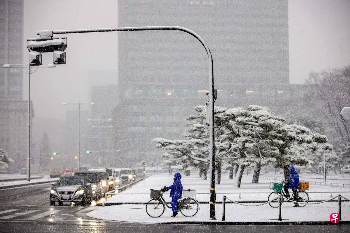 受寒流影响,日本东京周四出现强降雪,造成上百航班取消,200多人滑倒受伤送院。日本气象厅时隔四年向东京23区发布大雪警报,东京都中心积雪达10厘米,航空及铁路运行等均受到影响。单在周四,大雪导致羽田机场的近120趟国内航班取消。据东京消防厅透露,在6日至7日期间,东京共有215人因雪天跌倒送医,他们年龄介于九岁至97岁。(法新社)