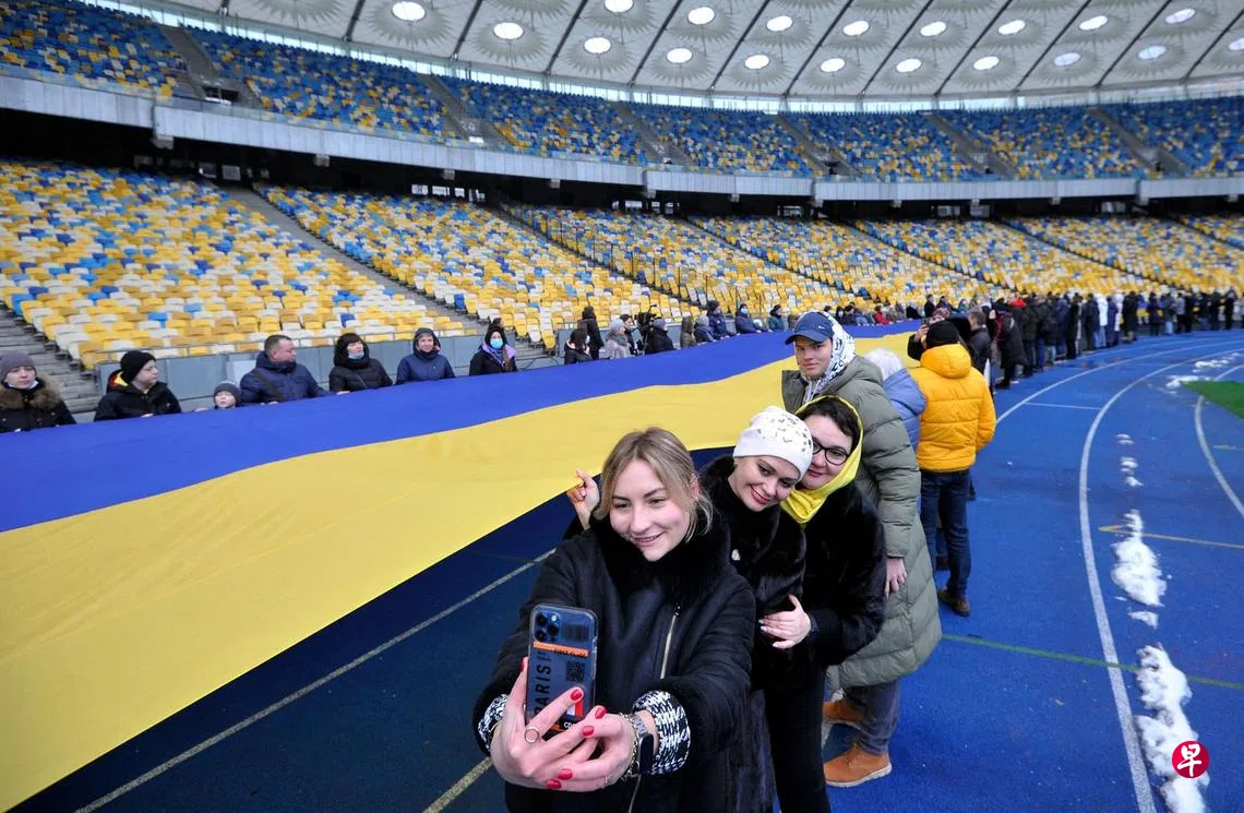 配合昨天的“团结日”,一群乌克兰人在首都基辅的奥林匹克体育场展开一面200米长的乌克兰国旗,以表明团结一致面对俄罗斯可能入侵的恐惧。媒体早前报道称,俄罗斯可能会在昨天入侵乌克兰,乌克兰总统泽连斯基不认同,反而把2月16日定为乌克兰团结日,呼吁全国上下挂国旗、播国歌,以示团结。(法新社)