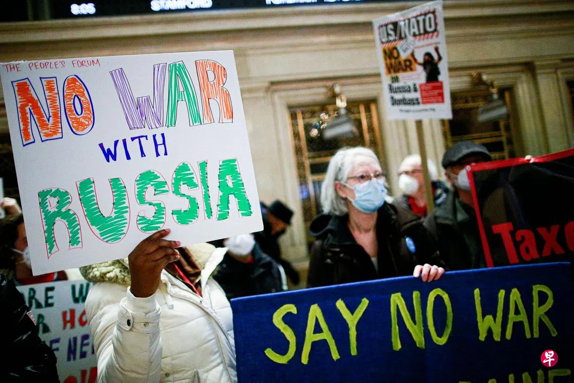 数十名美国民众周六在纽约中央火车站举行抗议活动,呼吁美国领导人多关注国内问题,不要介入俄罗斯和乌克兰潜在的战争。由于认为俄罗斯准备随时入侵乌克兰,美国已协助乌克兰和东欧盟国加强防御。美国副总统哈里斯出席慕尼黑安全会议时重申,美国致力于维护乌克兰主权,若俄罗斯进攻乌克兰,美国将连同盟友对其实施迅速与严厉的制裁。但美国反战团体担心,乌克兰可能成为“另一个阿富汗”,导致美国再度陷入无意义的漫长战争。(法新社)