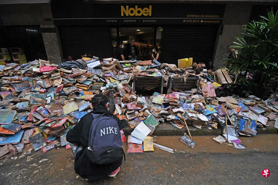 巴西里约热内卢州彼得罗波利斯市上周二遭受暴雨侵袭,并引发洪水和山体滑坡。截至上周六,死亡人数已上升至152人,另有100多人失踪,但他们存活的机会已越来越渺茫。除了搜救生还者,清理和重建工作也是一大挑战。图中这家书店的数千本书籍被洪水冲毁,直至上周六还堆在街道上。里约州政府已宣布将拨款1.5亿雷亚尔(约3928万新元),用于重建彼得罗波利斯市的基础设施。(法新社)