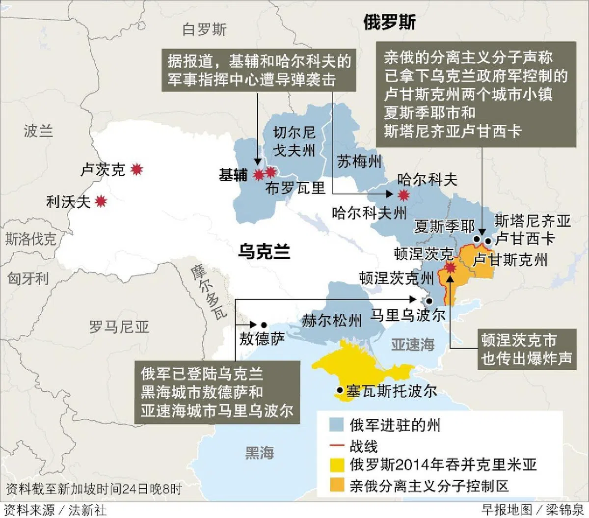 普京讲话结束几分钟后,黎明前宁静的基辅传出爆炸声,随后防空警报大作。据乌克兰国际文传电讯社报道,乌克兰各地军事设施遭火箭弹袭击,俄军在南部港口城市敖德萨和马里乌波尔登陆,基辅鲍里斯波尔机场附近传出枪声。敖德萨、马里乌波尔、距离俄乌边界仅35公里的东北大城市哈尔科夫、顿涅茨克州政府所在城市克拉马托尔斯克等地,也传出爆炸声。敖德萨地方政府说,俄军空袭一处军事基地,造成18人死亡。