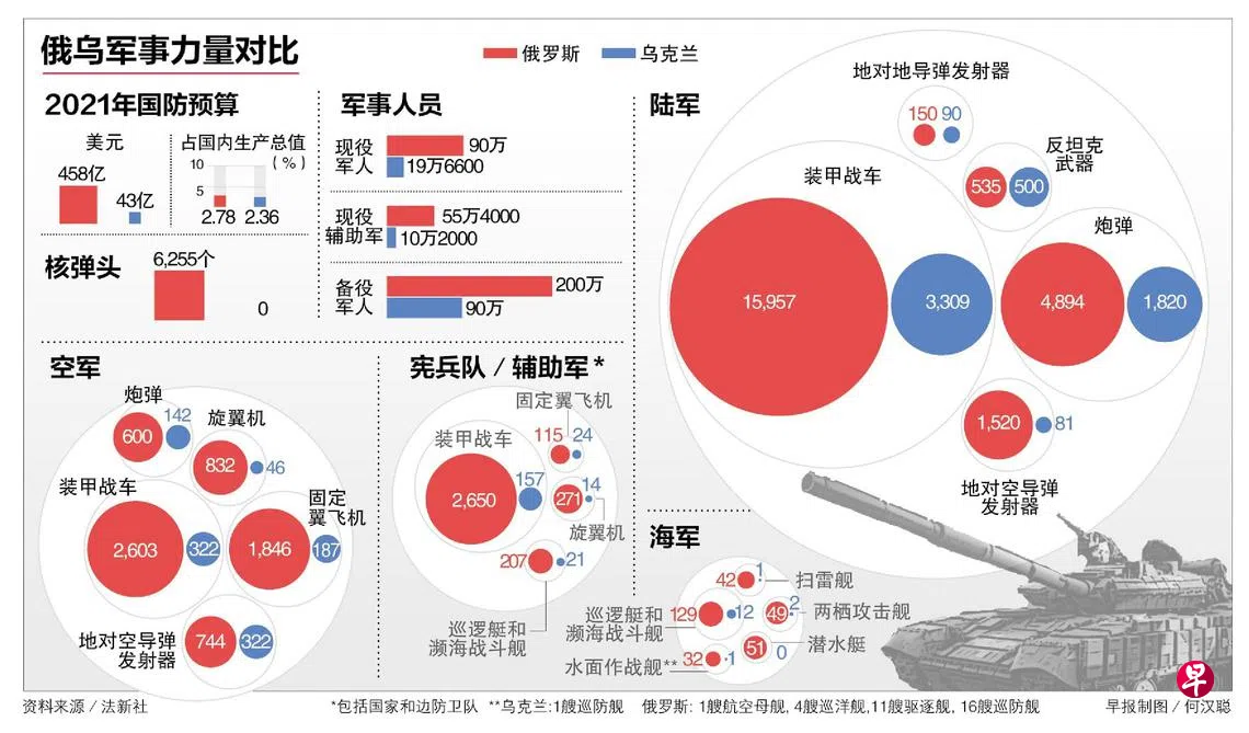 英国智库国际战略研究所(IISS)的数据显示,俄国拥有28万名陆军,现役军事人员多达90万人。其战斗坦克数量是乌克兰的三倍,供2840辆。
