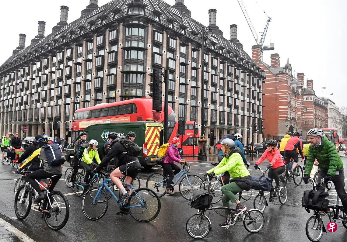 图为伦敦周二早上的高峰期,人们因地铁暂停运作选择骑脚踏车上班的情景。(路透社)