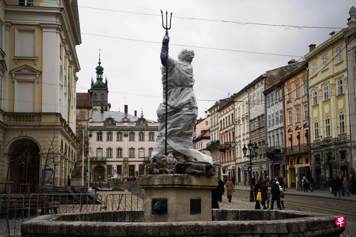 (利沃夫综合电)俄军大举入侵乌克兰,多个城市烽火四起。在还未受战火波及的历史文化古城利沃夫(Lviv),一场文化遗产保护行动正如火如荼进行。在利沃夫主要广场,工作人员用阻燃织物,把罗马众神雕像包裹起来。部分雕像周围还筑起了棚架,保护它们免受倒塌的砖石杂物破坏。至于能拆卸和搬动的文物则转移到安全地方保存。