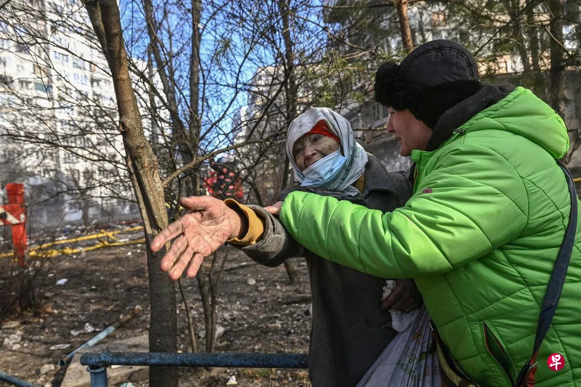 俄罗斯不断加强对乌克兰首都基辅,尤其是住宅区的轰炸。基辅市中心周二凌晨传出四声爆炸巨响,被击中的包括一栋16层高的住宅楼。该市的波迪尔斯克区也有一栋住宅楼遇袭。急救部门说,这轮空袭造成至少两人死亡。图中这名老妇从其中一栋被炸毁的住宅楼安全疏散后,仍情绪激动。目前,基辅的北面和东面已被俄军包围,350万名居民中约有半数已经撤走。(法新社)