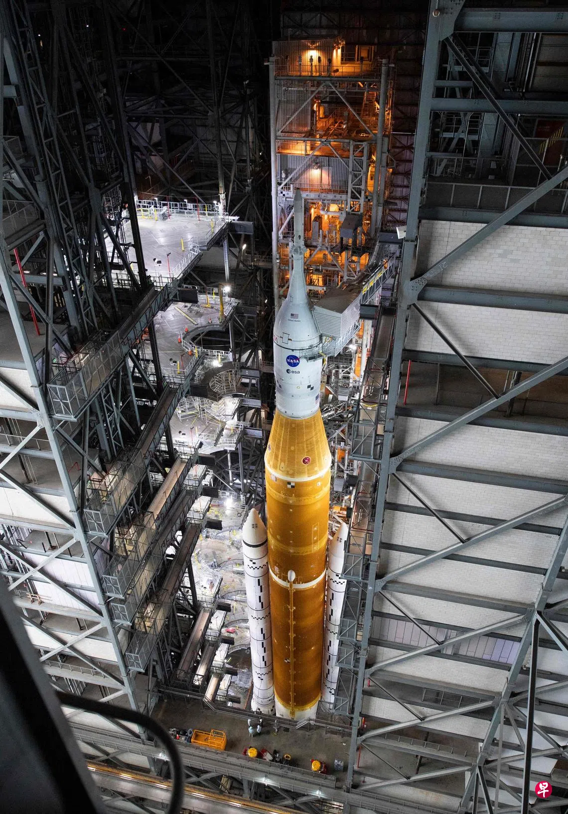 美国宇航局的新月球火箭将于当地时间星期四在佛罗里达州的发射台首次亮相,并在接下来几周展开最后一轮测试,以决定何时可以执行重返月球的阿尔忒弥斯计划,重启人类探索月球的新时代。这个太空发射系统(Space Launch System)火箭已完成和“猎户座”宇宙飞船的组装,在肯尼迪航天中心标志性的飞行器装配大楼内蓄势待发。这枚火箭有32层楼高,重达575万吨,费时11小时从飞行器装配大楼运送到约6.5公里外的39B发射台后,会于4月3日进行“湿式彩排”,即最后的发射前测试,测试结果能确认它是否已准备好执行任务。(法新社)