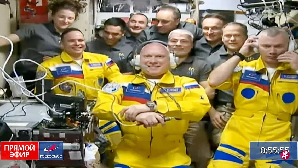 三名俄宇航员进入国际空间站时,受到站内七名宇航员热烈欢迎。俄宇航员的航天服以黄色为主,并配有少许蓝色,这两个颜色正好是乌克兰国旗的颜色,不免引发媒体解读。
