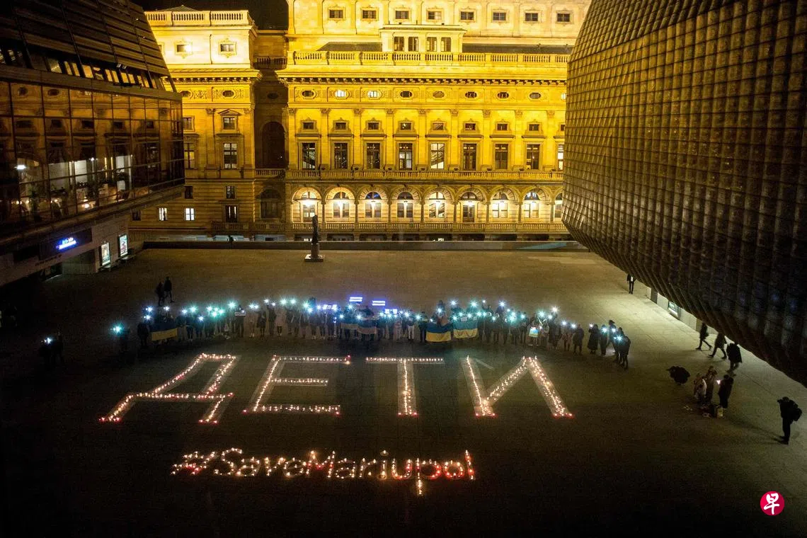 反战人士周二在捷克首都布拉格集会,高举乌克兰国旗及开启手机电筒,站在用蜡烛排成的“儿童”及“拯救马里乌波尔”字样前,声援遭俄罗斯入侵的乌克兰。乌克兰东南部港口城市马里乌波尔被俄军围困多时,现已陷入断水断电、粮水短缺的困局。尽管连日来已有数以万计的人逃离该市,但据乌克兰总统泽连斯基,当地仍有近10万人被困。他再度呼吁俄罗斯为无辜平民提供安全的人道走廊撤离。(法新社)