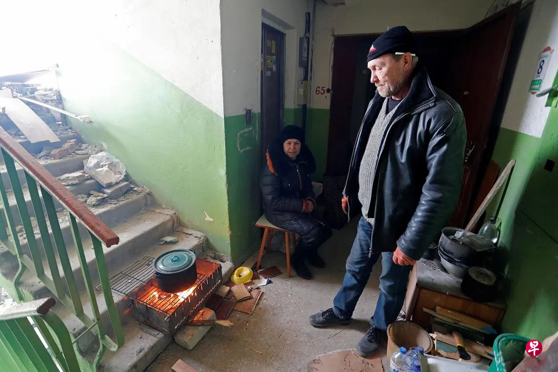 乌克兰居民 楼梯口生火烹煮订户赠阅文章乌克兰南部港口城市马里乌波尔遭俄军围困数周,并且已经断水断电。图为当地居民被迫在一座公寓楼的楼梯口生火烹煮食物。(路透社)俄乌战争乌克兰危机上一篇说普京“不能继续掌权” 拜登再澄清是表达“道德愤慨”下一篇早说