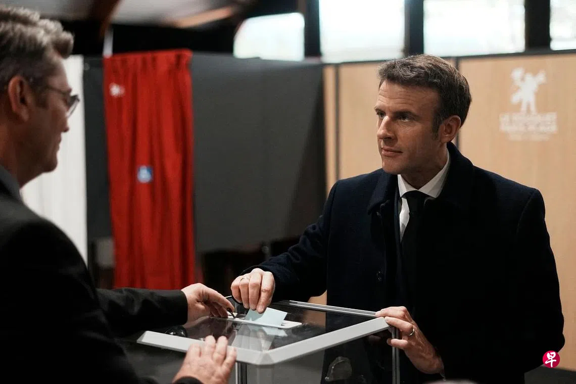 法国总统选举首轮投票昨天举行,全国各投票站在当地时间10日上午8时(新加坡时间10日下午2时)开放至晚上8时,之后首批出口民调将对外公布,初步结果预计当天深夜出炉。此次选举有12名候选人。根据选前民调,寻求连任的马克龙以26%支持率领先,紧追在后的是获得24%支持率的极右派国民联盟领袖勒庞;两人可能在第二轮投票对决。根据法国选举条例,首轮投票若没人赢得50%以上的选票,得票率最高的两人将晋级第二轮再决胜负。图为马克龙在位于法国北部的家乡勒图凯市一投票站投下神圣的一票。(法新社)