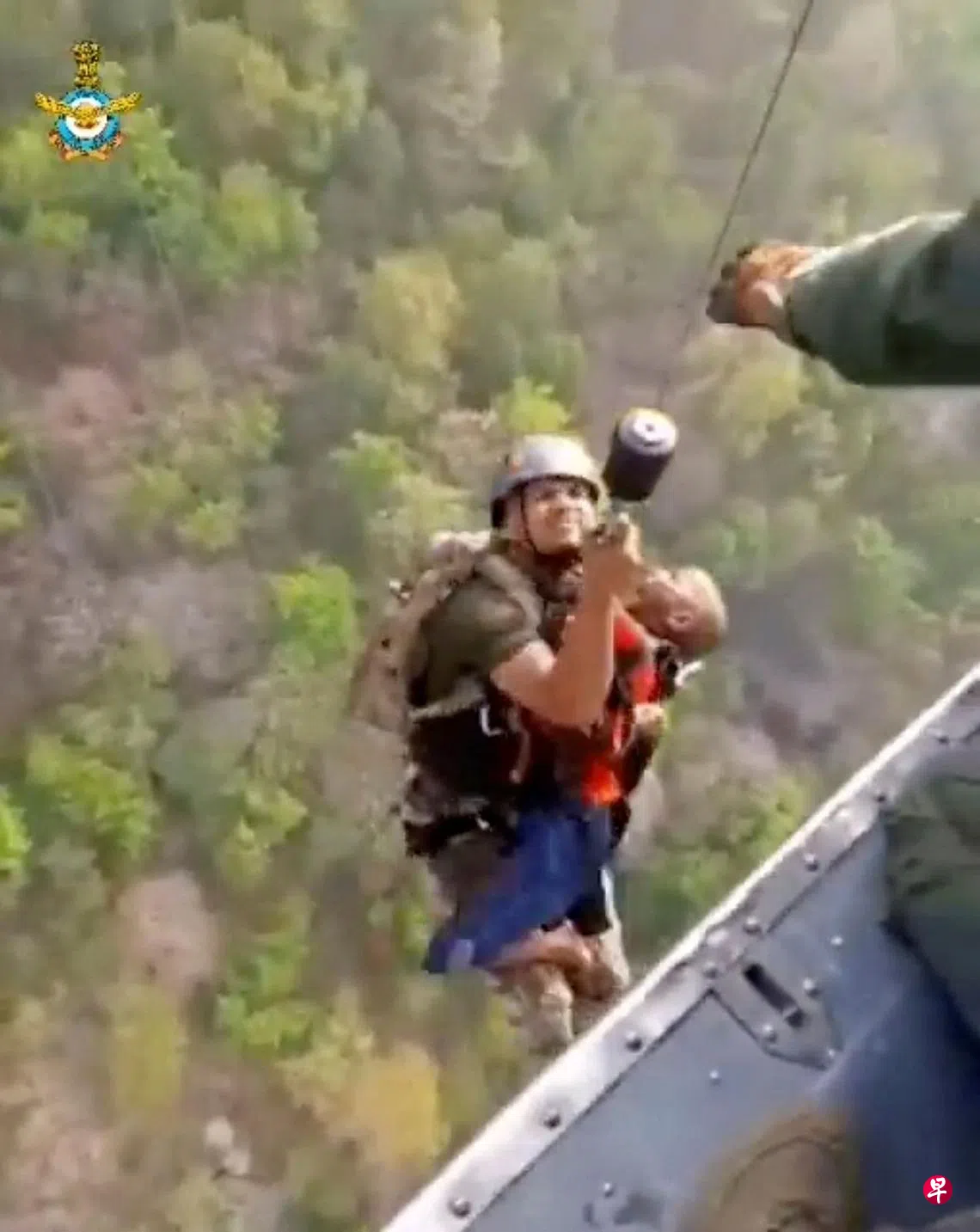 印度东部贾坎德邦偏远山区星期天发生缆车在空中相撞事故,造成两人死亡,近50人受困高悬空中的缆车至少一天,其中三人更受困两天,直到昨天才获救。死者中,一人因相撞事故死亡,另一人在试图爬上救援直升机时坠落身亡。警方说,其中一部缆车从电缆上部分脱落,结果与另一部缆车相撞。图为救援人员与一名男孩一起被拉上直升机。(路透社)