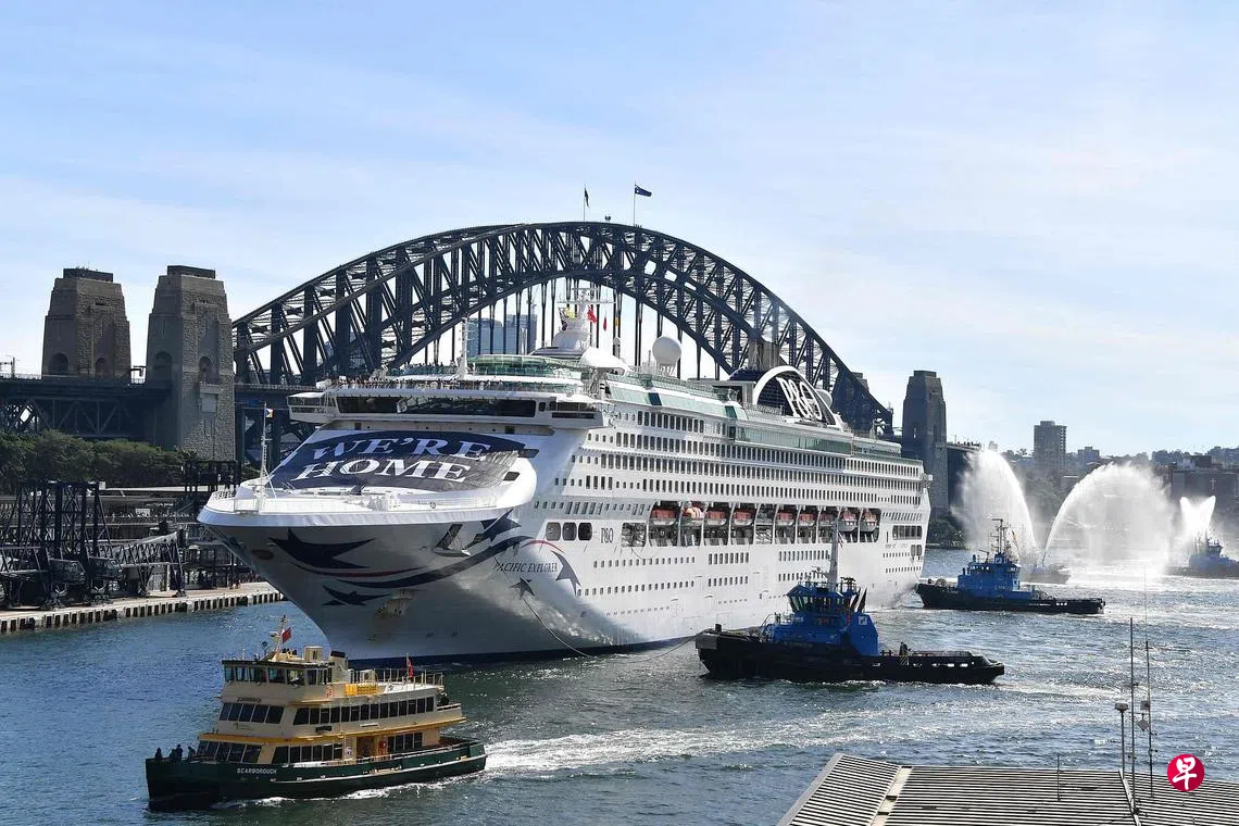 大批民众昨天上午聚集在悉尼海港大桥见证太平洋探险号(Pacific Explorer)缓缓驶入港口,拖船在游轮两侧喷洒水柱,船头则横挂着写上“我们回家了”的大幅布条。