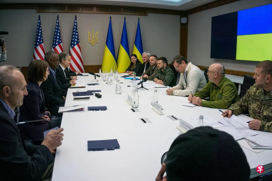 美国国务院一名官员透露,国务卿布林肯和防长奥斯汀周日在基辅同乌克兰总统泽连斯基会晤,表达了美国的支持,包括外交官将重返和提供另一批超过7亿美元(近10亿新元)的直接和间接军事援助。