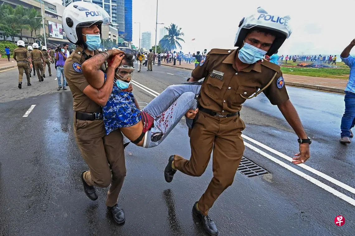 斯里兰卡陷入经济危机,周一爆发更大规模的反政府示威。示威群众在首都科伦坡的总统府外面要求总统拉贾帕克萨为国家危机下台负责,结果与支持政府的群众起冲突,造成至少70人受伤。图为当地警察抬着一名受伤的市民就医。斯里兰卡总理马欣达·拉贾帕克萨(76岁)当天宣布辞去总理一职,他是总统的哥哥。斯里兰卡政府周一宣布全国各地无限期戒严,并派出军警驻守站岗,防止冲突持续。因为燃油、医疗品与必需品严重短缺,加上断电情况严重影响民生,斯里兰卡从今年3月31日以来爆发示威浪潮。(法新社)