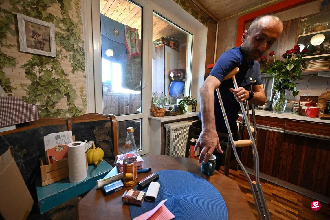许多乌克兰军人在对抗俄军的战争中蒙受重伤被迫截肢。来自亚速营的苏雷亚马尼斯维利(43岁)是其中一人,但他仍然充满战斗意志。他希望尽早装上义肢,准备再次回到前线作战。苏雷亚马尼斯维利一直在乌南港市马里乌波尔抗击俄军,今年3月遭到俄军坦克炮击被弹片击中,虽然保住性命,但膝盖以下被截肢。他透露,有不少像他这样的伤兵装了义肢继续战斗保卫国家。乌克兰总统泽连斯基今年4月中透露,开战以来已有1万名乌克兰士兵受伤。(法新社)