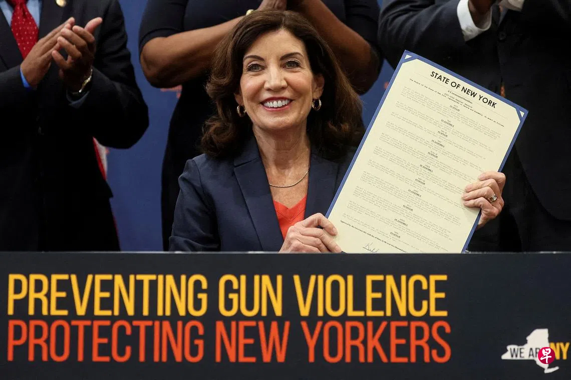 (纽约综合电)美国纽约州长霍楚尔周一签署10项法案,内容包括禁止未满21岁者购买半自动步枪、禁止不符合资格者购买防弹背心、禁止大容量弹匣等。