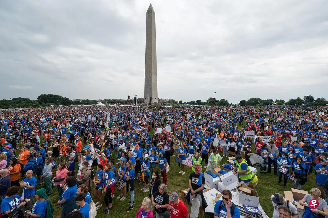 美国媒体报道,在首都华盛顿,尽管下着雨,数千人在集会开始前就来到华盛顿纪念碑前高举标语,其中一条写道:“孩子是不可替代的,而参议员是(可替代的)。我们会用投票说话。”一名中学女生举的牌子写道:“我想在学校有安全感。”