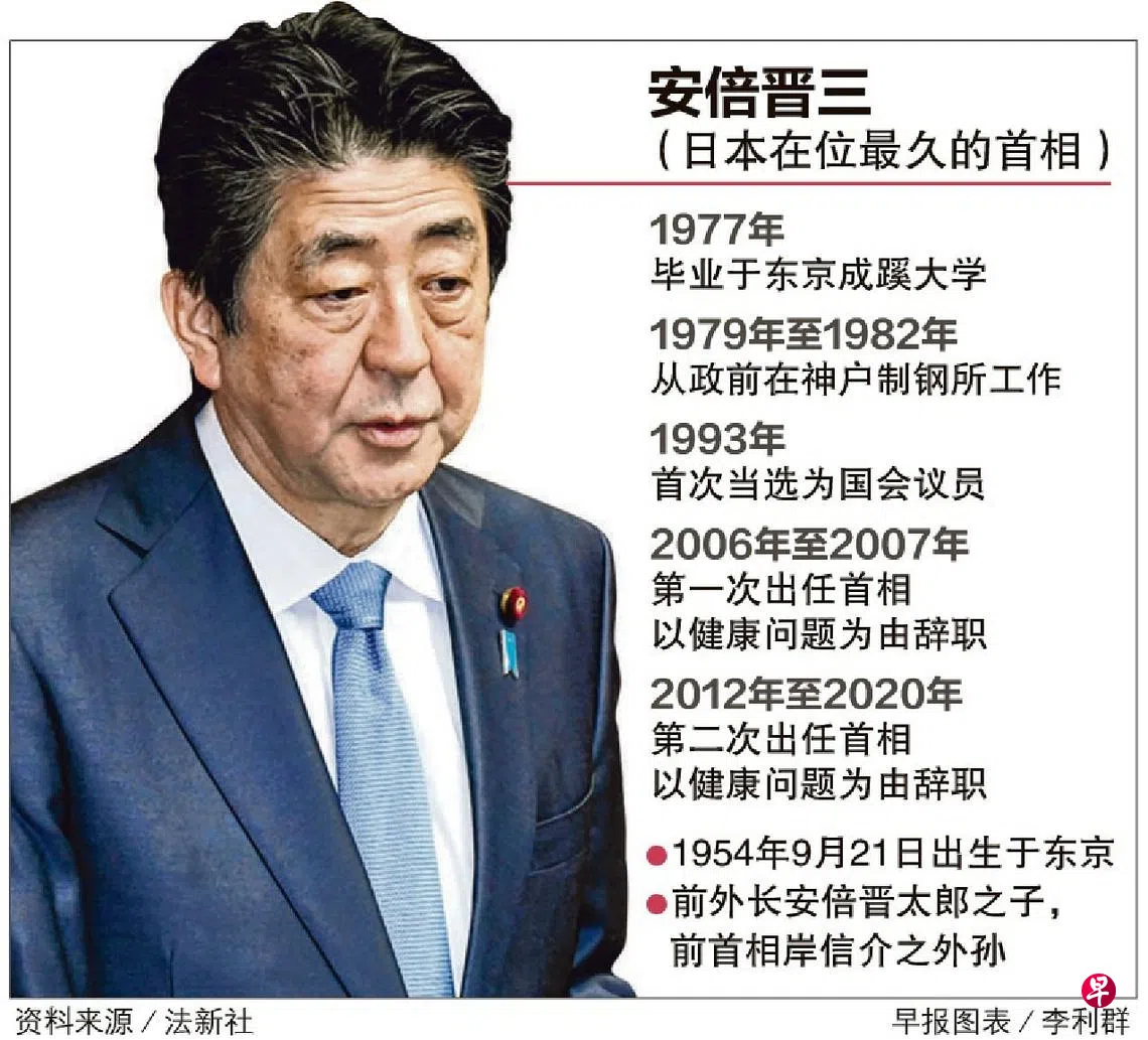 (东京综合电)日本前首相安倍晋三周五(7月8日)在奈良的竞选活动中遭枪击身亡,震惊海内外。他是日本在位最久的首相,曾提出安倍经济学挽回日本持续低迷的经济。他力主加强日本自卫队,也在任内建立重要的外交关系,并寻求和中国与日俱增的影响力抗衡。
