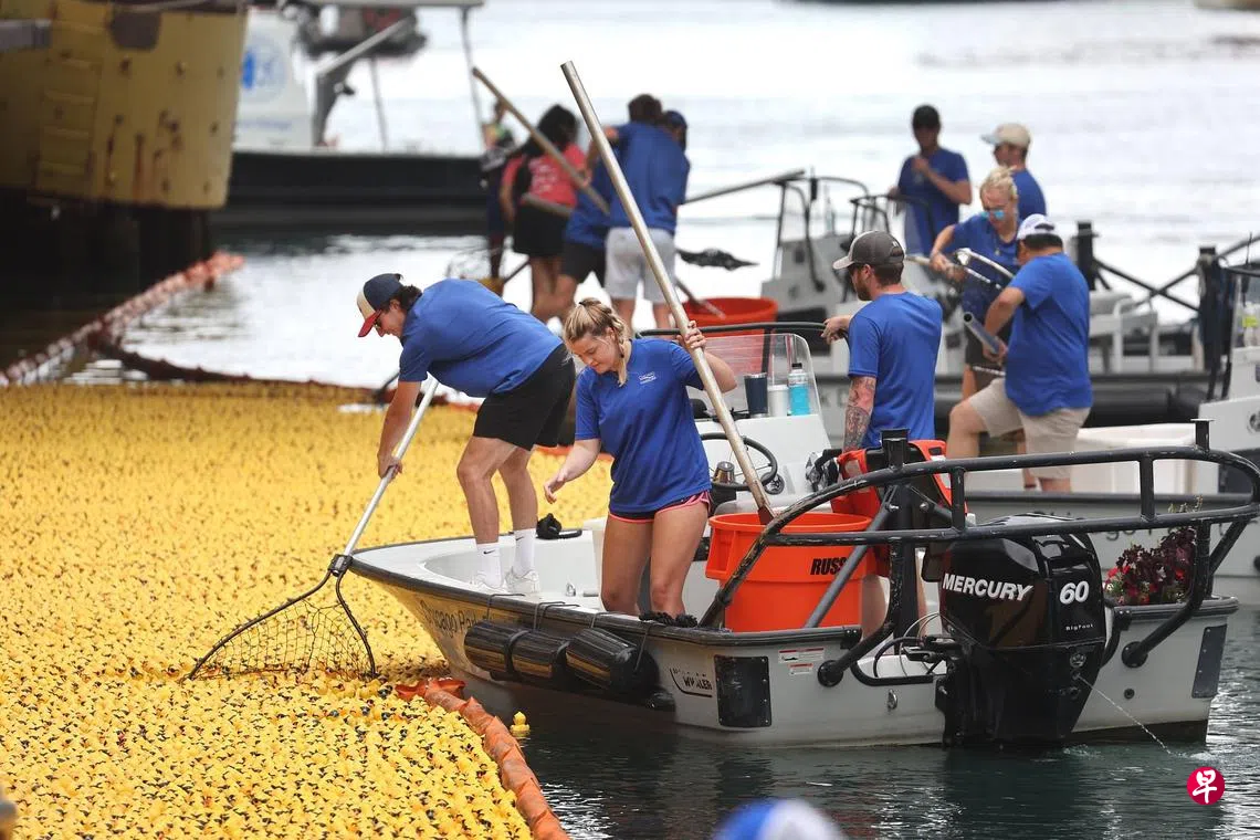 美国伊利诺伊州于8月4日举行第17届“小黄鸭”慈善竞赛(Chicago Ducky Derby),活动组织人员向河中放置了7万5000只橡皮鸭,捐赠者以每只5美元(约7新元)的捐款赞助橡皮鸭“参加比赛”。第一只冲过终点线的橡皮鸭所属捐赠者将获得奖品和现金。(法新社)