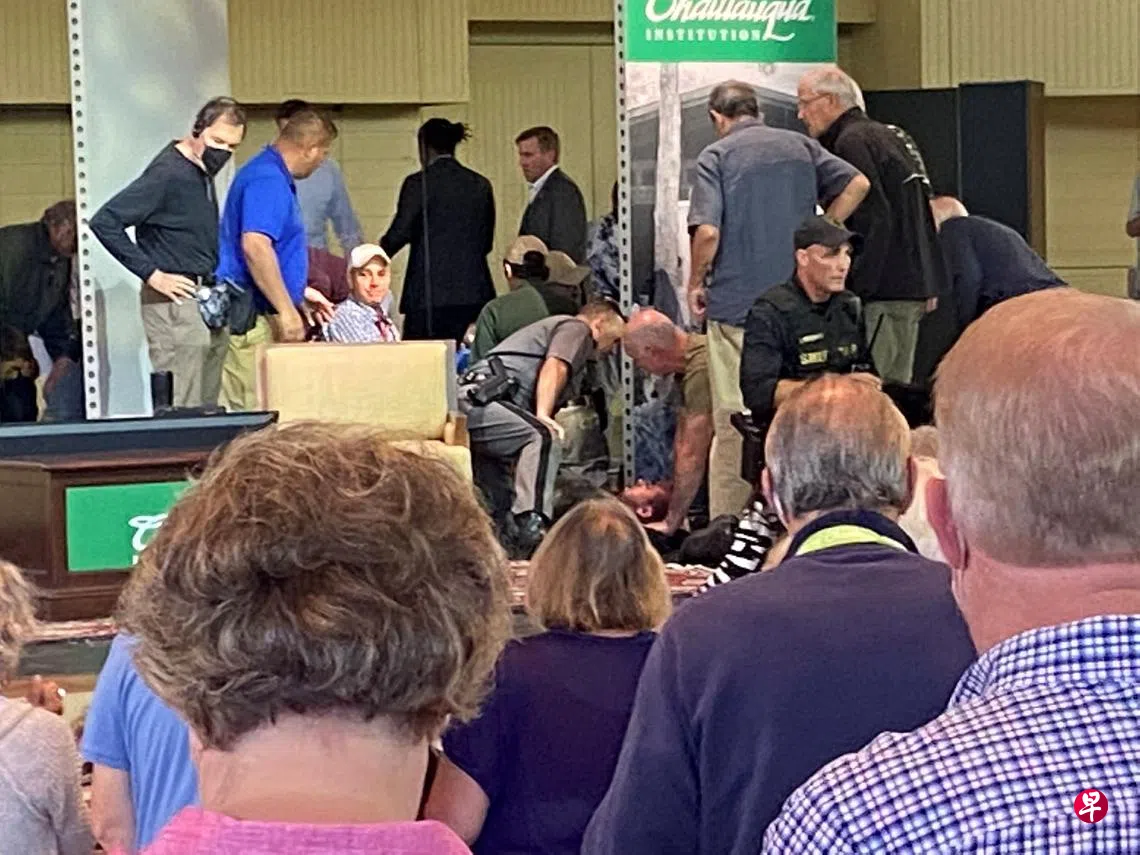 现年75岁的拉什迪(Salman Rushdie)星期五(8月12日)在纽约州肖托夸研究所准备发表演讲时,一名男子突然冲上台扑向他,现场顿时大乱。好些人合力将行凶者制服,可是拉什迪已被刺倒地不起。