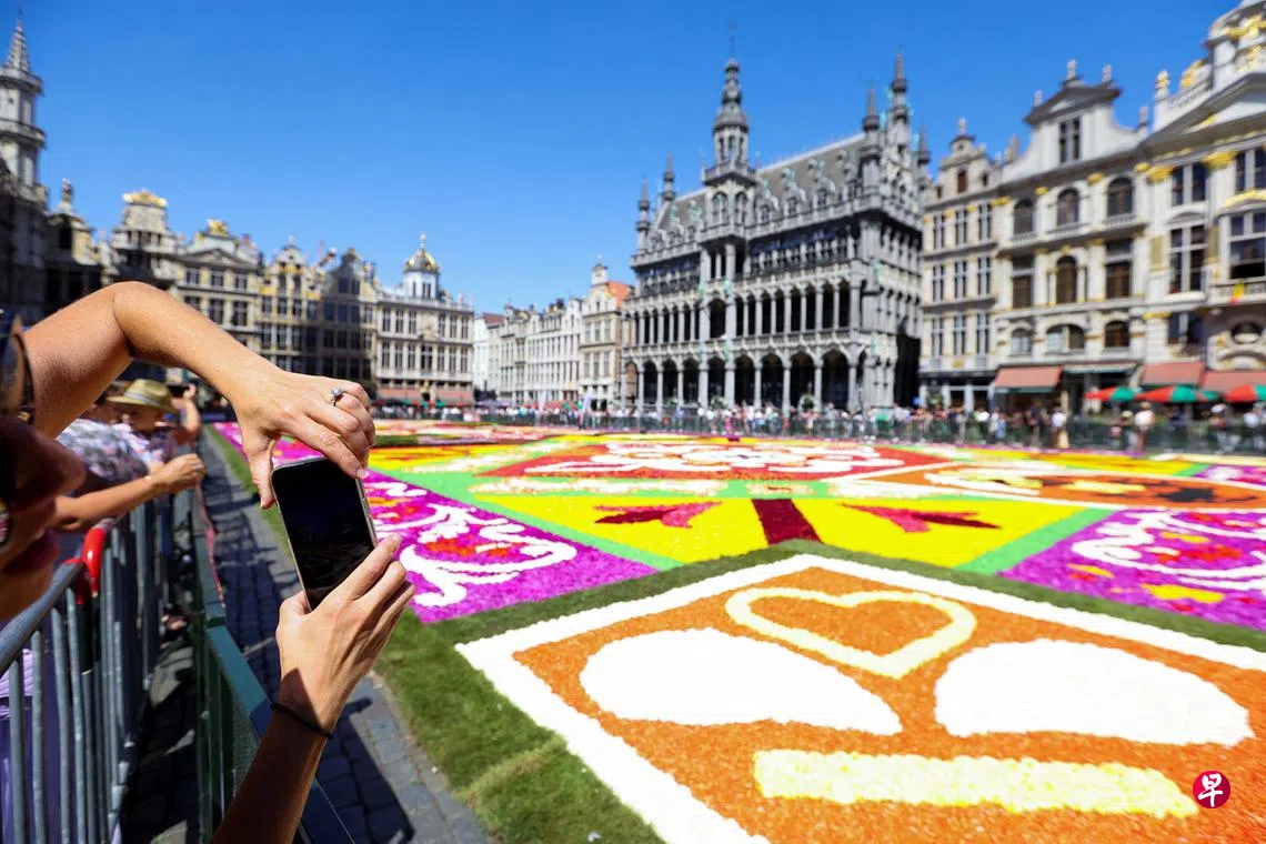 比利时首都布鲁塞尔两年一度的花毯节再次登场。由于欧洲正遭受热浪袭击,工作人员首次选择更耐热的花朵和盆栽植物,包括将原本使用的秋海棠换成含水量更高的比利时大丽花。当地接下来几天的气温预计会在30摄氏度以上。上周五(8月12日),100名包括外国人在内的志愿者顶着炎热天气,花了六个多小时布置花毯。设计今年花毯的墨西哥艺术家阿瓜多(Roo Aguilar Aguado)说,从积极的角度来看,强烈的阳光将带出花毯最亮丽的色彩。他也形容这次的花毯展示为“瞬时艺术(Ephemeral Art)的奥运会”。今年的花毯面积达1680平方公尺,共用了40万朵花。(路透社)