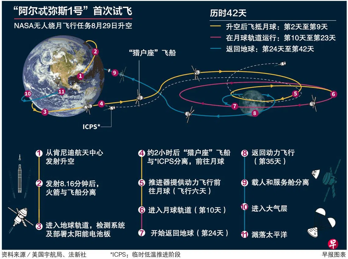 美国宇航局(NASA)说,如果一切顺利,这个美国历史上最强大的运载火箭——太空发射系统(Space Launch System,简称SLS)和搭载的“猎户座”飞船预定在当地时间星期一上午8时33分(新加坡时间晚上8时33分)首次试飞,展开“阿尔忒弥斯1号”无人绕月飞行测试任务。它会从佛罗里达州肯尼迪航天中心升空,然后绕月球飞行,深入到比任何人造航天器飞得更远的地方,并在42天后返回地球。