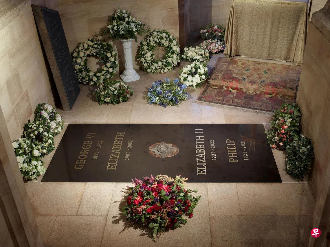 (温莎法新电)白金汉宫星期六(9月25日)发布英女王伊丽莎白二世长眠于温莎堡乔治六世国王纪念礼拜堂的墓碑,新铺在地板上的黑色大理石简略地记录了女王的生卒年份:伊丽莎白二世,1926-2022。