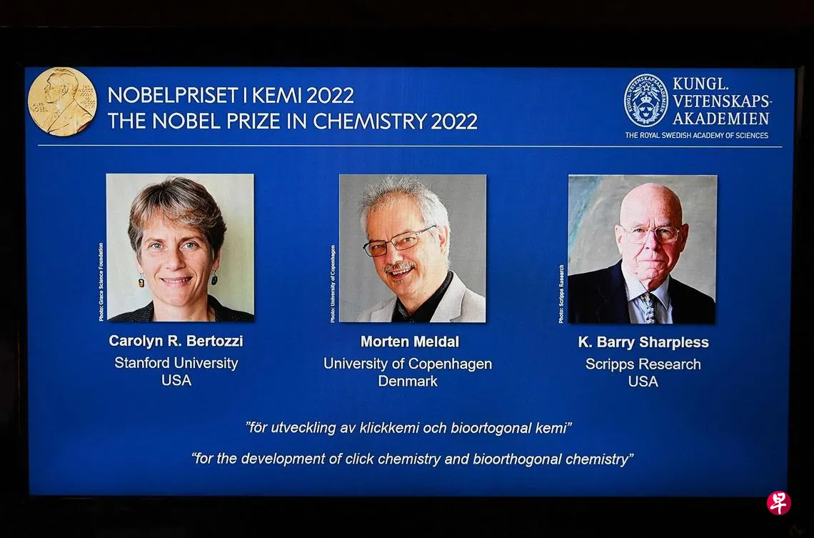 (斯德哥尔摩综合电)瑞典皇家科学院星期三(10月5日)把2022年诺贝尔化学奖授予分别来自美国和丹麦的三位科学家,以表彰他们在发展点击化学和生物正交化学方面的贡献。